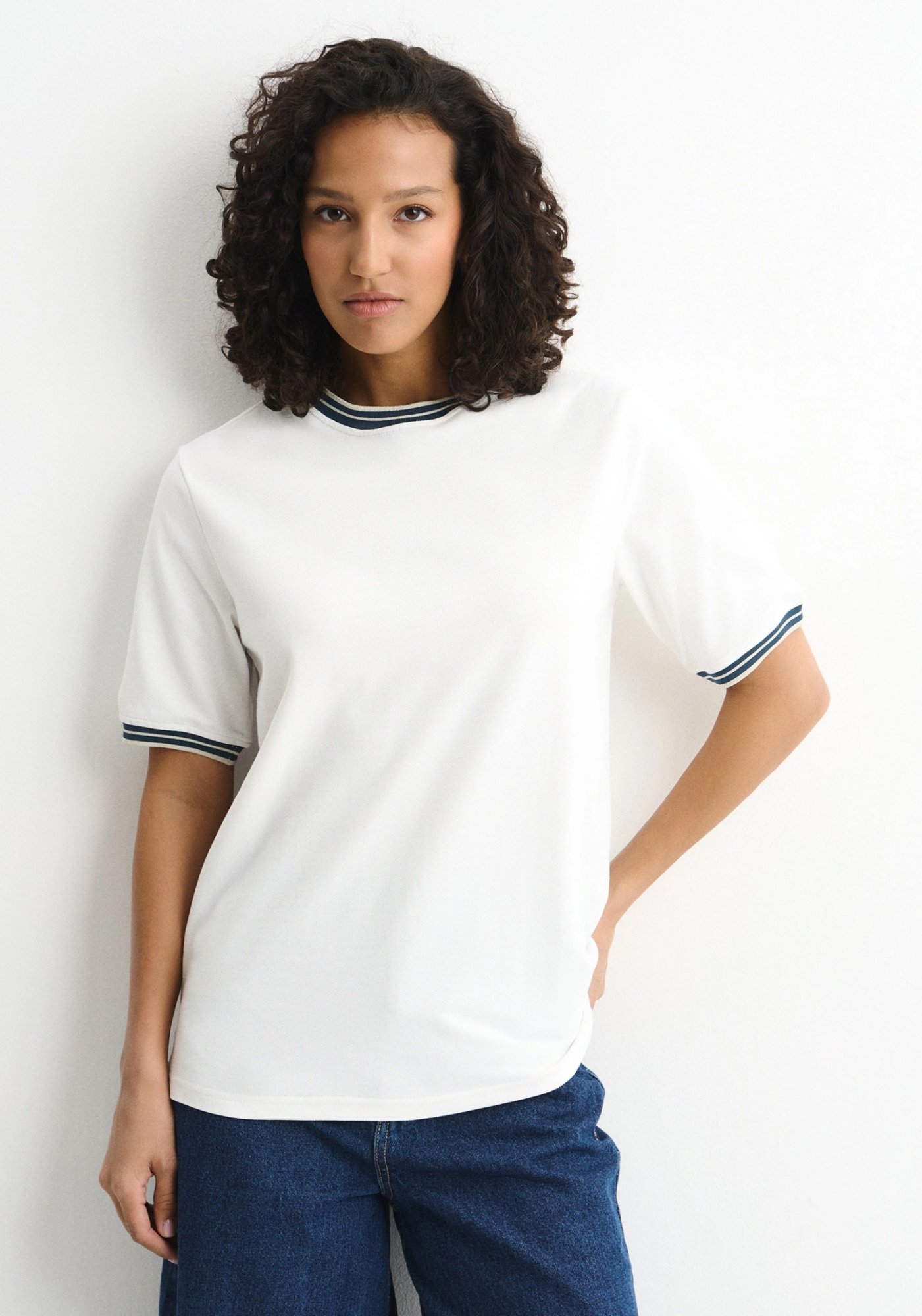 Стильная женская футболка из премиального турецкого трикотажного хлопкового полотна - пике. Пике, сочетая в себе элегантность и универсальность, стал важным элементом модного мира и текстильного дизайна. Его способность придавать изделиям изысканный вид при сохранении комфорта и прохлады делает его выбором для тех, кто ценит стиль и практичность. Этот фактурный материал хорошо пропускает воздух и отличается износостойкостью. Горловина и рукава данной модели декорированы трикотажной (эластичной) тесьмой. Контрастные полоски с люрексом по краю воротника и рукавов придают футболке стильный, графичный акцент. Полуприлегающий силуэт поддерживает естественную посадку изделия и свободу движений. Наши невероятно красивые футболки отлично сочетаются с брюками, шортами, джинсами и различной длины юбками. Свободный крой и элегантная форма рукавов не только придают изделию стильный и модный вид, но и гарантируют его обладательнице комфорт даже в самые жаркие дни. Такая стильная модель идеально подойдёт в качестве подарка маме, подруге, дочке и любимой на праздник. Гладить с изнанки. Стирка при t не более 30С. Деликатный отжим, отбеливание запрещено. При соблюдении наших несложных правил ухода одежда DS будет радовать Вас долгое время!