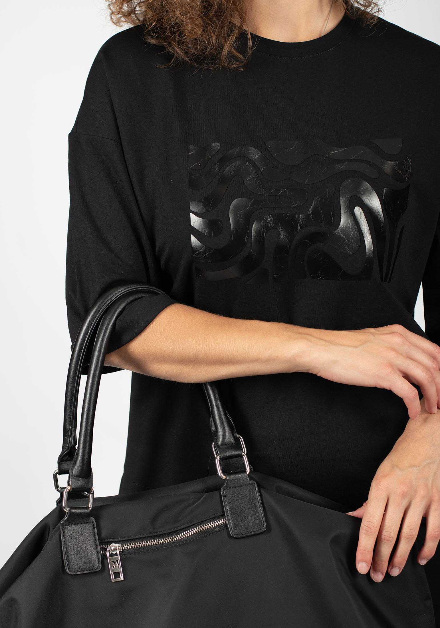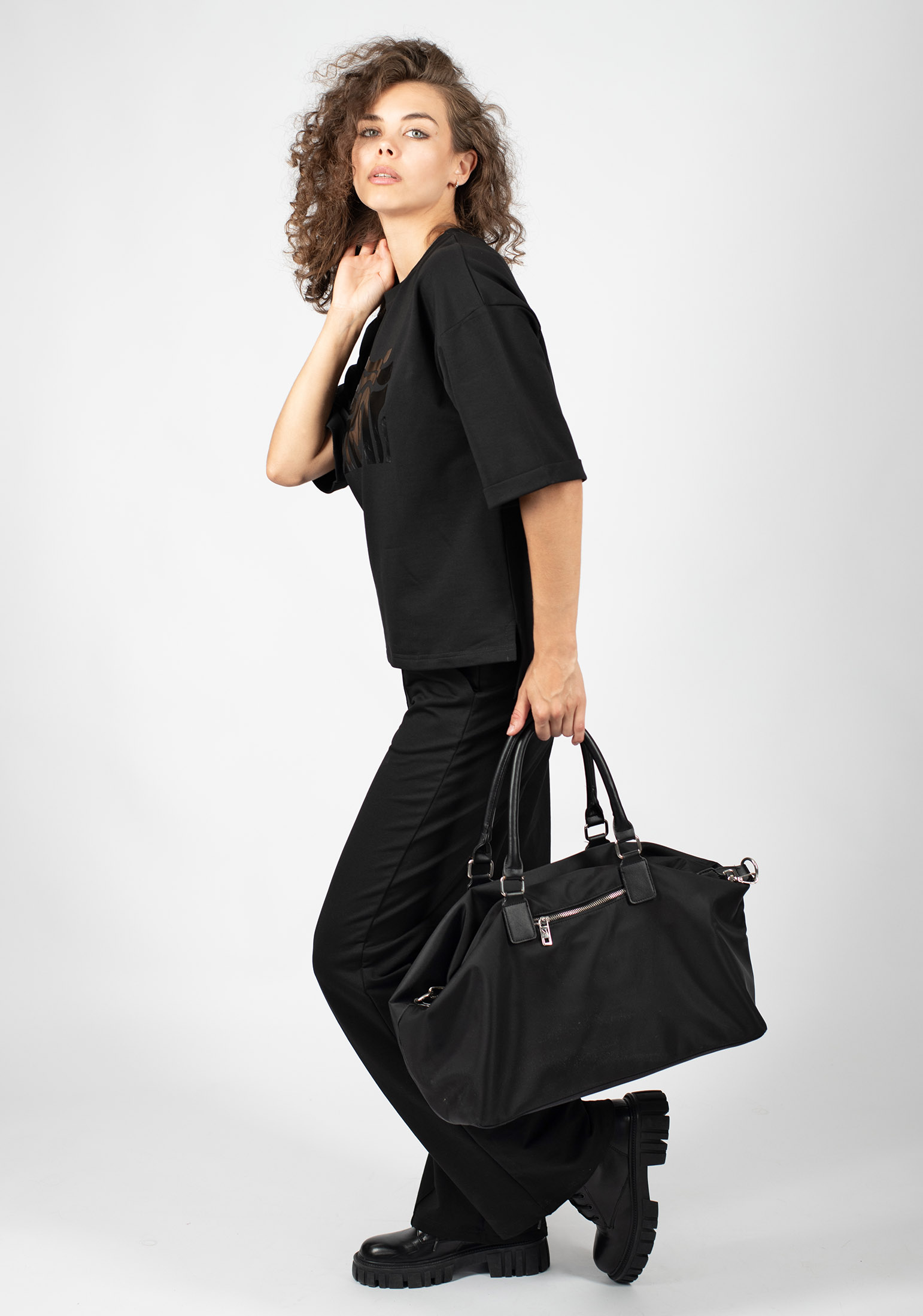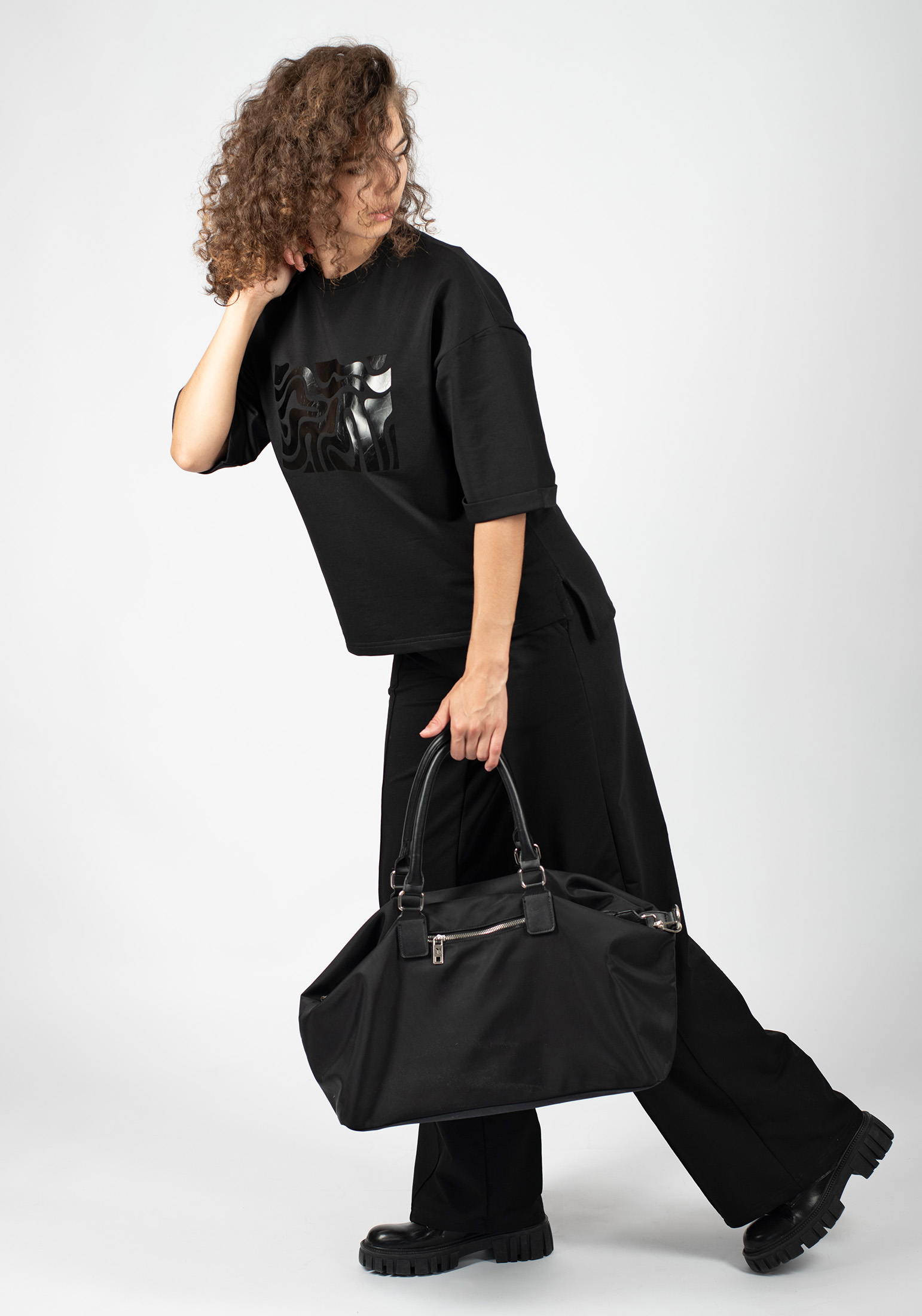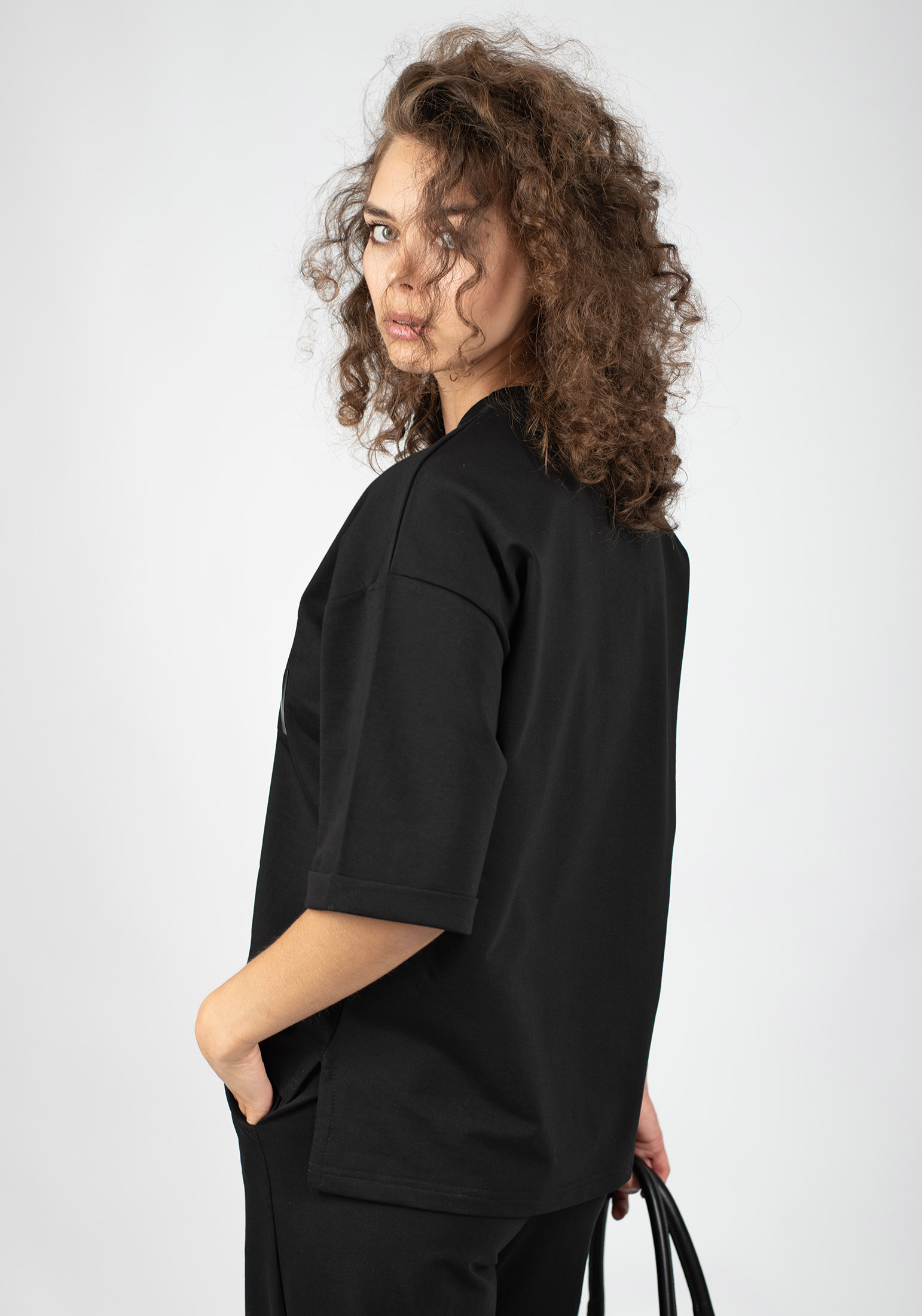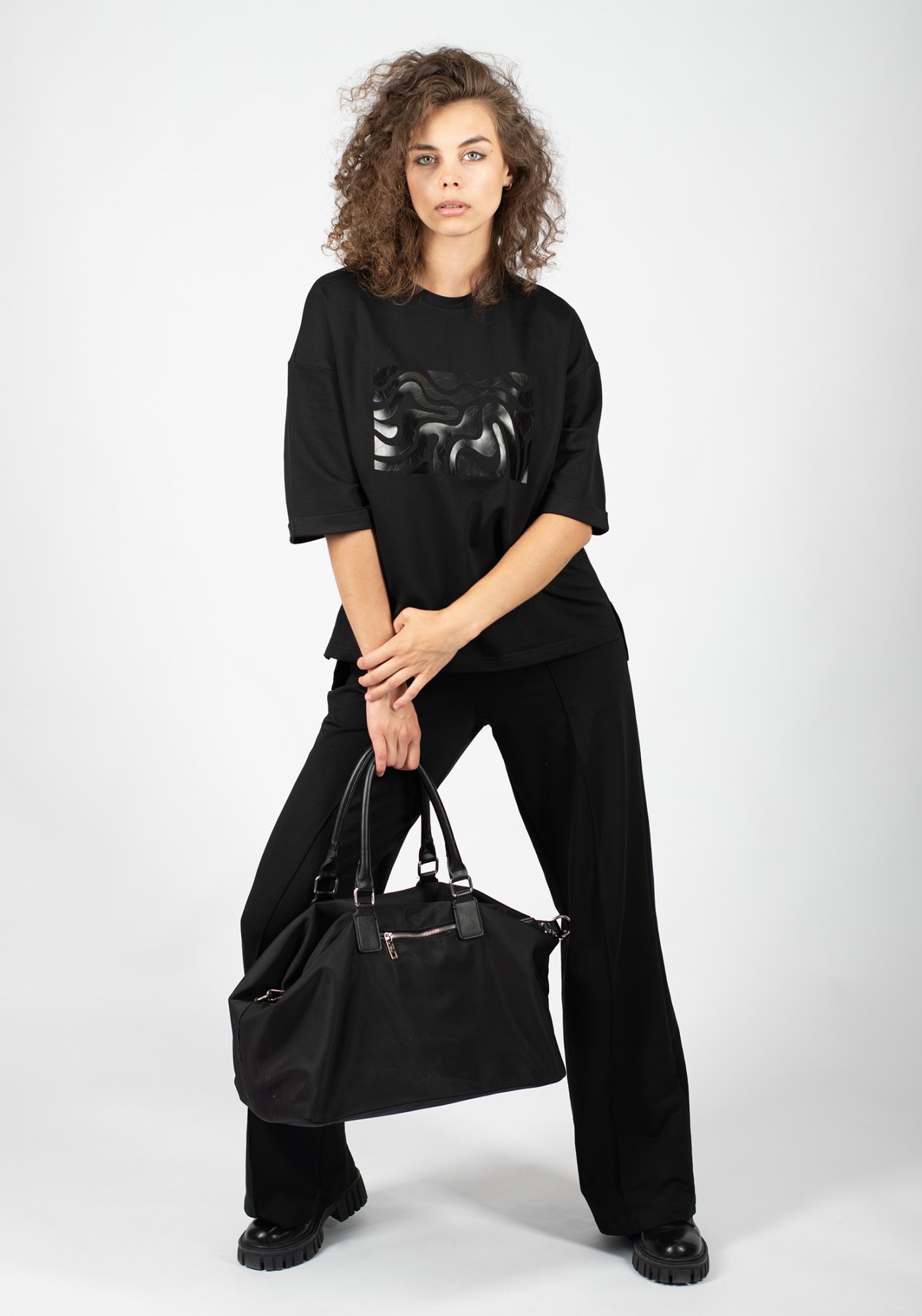 Стильный женский костюм, состоящий из брюк палаццо со стрелками (защипами) и джемпера с коротким рукавом, выполненный из высококачественного турецкого футера 2-х нитки. Оригинальный джемпер с коротким рукавом и круглым вырезом воротника. Элегантный образ создаётся за счёт разной длины спинки и полочки и разрезов в боковых швах. На полочке изделия шикарный принт с эффектом кожи. На рукавах отвороты, благодаря которым видно красивую фактуру футера. Стрелки защипы на брюках - это стильная и элегантная деталь, которая придает особый шик вашему образу. Трикотажные женские брюки свободного силуэта. На поясе удобная и широкая резинка, два вместительных боковых кармана. Наша одежда свободного кроя - идеальное решение на каждый день. Такой крой даёт ощущение комфорта, свободы и раскованности. Наша актуальная модель будет прекрасным подарком на новый год, к 8 марта, день святого Валентина, на день рождение, на день матери. Сделано в России с любовью к Вам! Гладить с изнанки. Стирка при t не более 30С. Деликатный отжим, отбеливание запрещено. При соблюдении наших несложных правил ухода одежда DS будет радовать Вас долгое время!