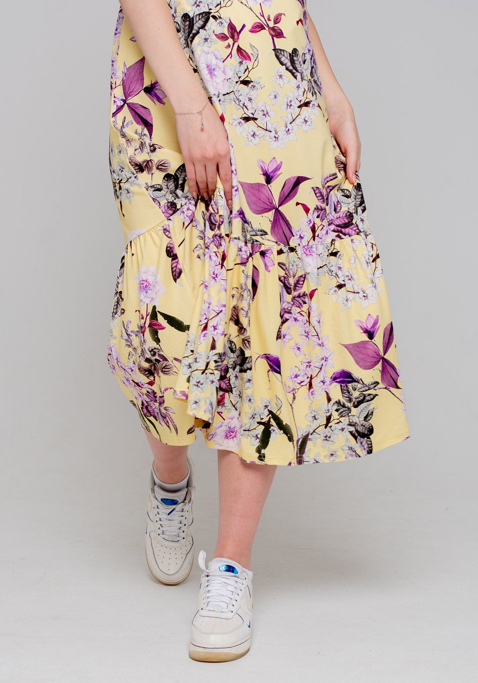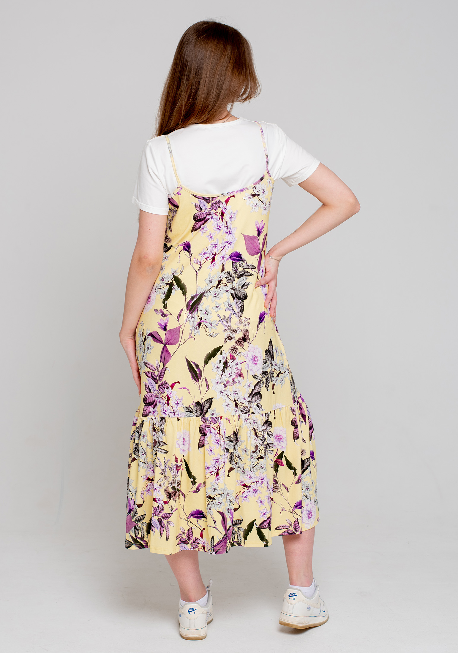 Женский сарафан на брителях свободного силуэта, выполнен из лёгкой вискозной ткани. По низу сарафана притачной волан. Удобная модель, скрывает недостатки фигуры, выгодно подчеркивая достоинства. Гладить с изнанки. Стирка при t не более 30С. Деликатный отжим, отбеливание запрещено.